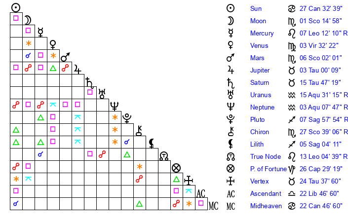 Sun | 27 Cancer 32 | 28 Cancer 14 | 22 Leo 26 |