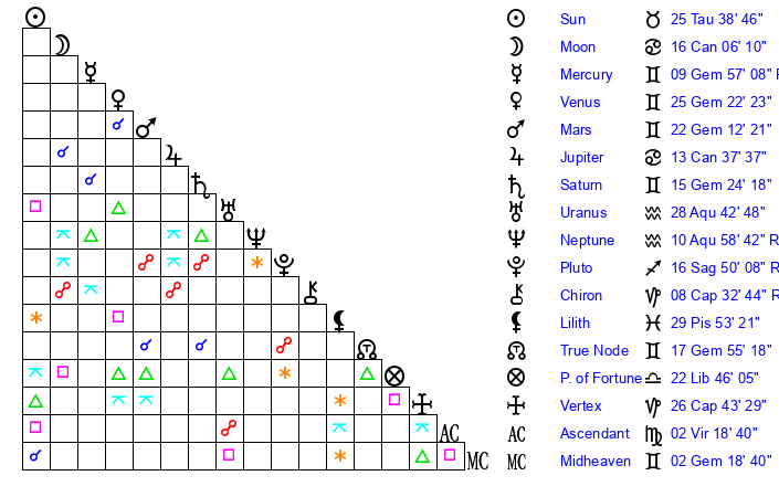 Sun | 25 Taurus 39 | 26 Taurus 4 | 17 Gemini 44 |
