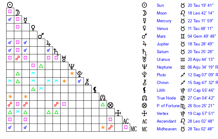 Sun | 20 Taurus 20 | 20 Taurus 17 | 14 Gemini 22 |