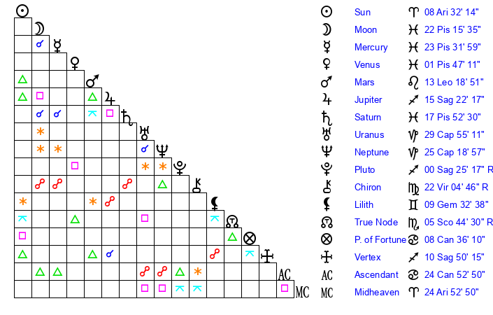 | Moon | 22 Pisces 8 | 12 Aries 48 | 26 Aries 19 |