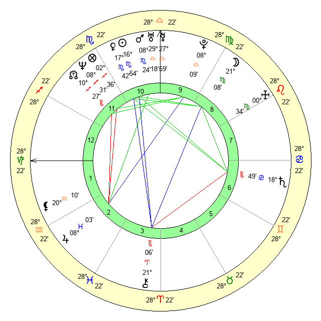 | Moon | 21 Virgo 6 | 15 Cancer 28 | 29 Cancer 45 |