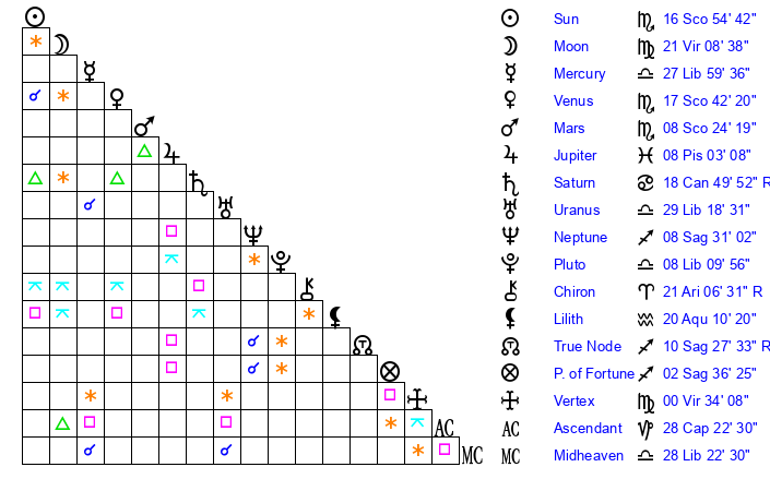 | Sun | 16 Scorpio 54 | 17 Scorpio 33 | 8 Capricorn 37 |