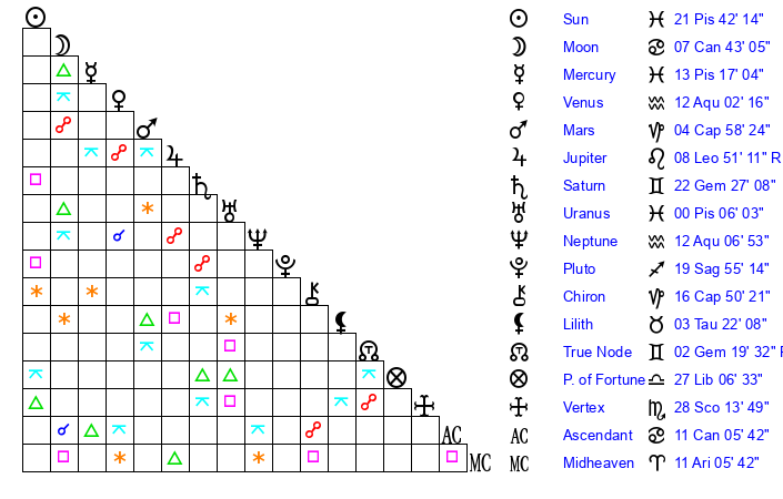 Moon | 7 Cancer 36 | 4 Virgo 33 | 4 Taurus 12 |