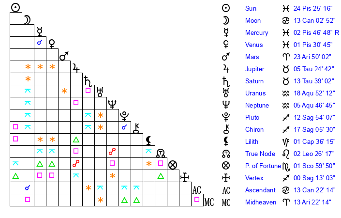 | Sun | 24 Pisces 25 | 24 Pisces 22 | 19 Aries 10 |