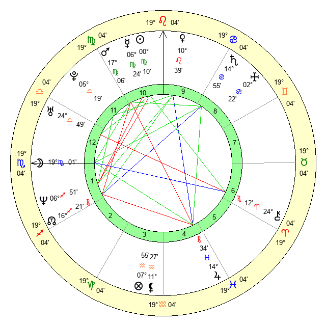 | Moon | 19 Scorpio 11 | 6 Virgo 7 | 25 Virgo 36 |