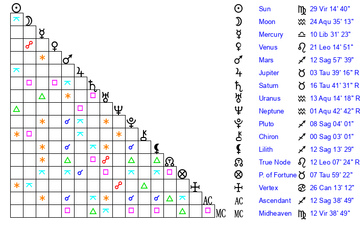 | Moon | 24 Aquarius 37 | 9 Libra 47 | 7 Aquarius 1 |