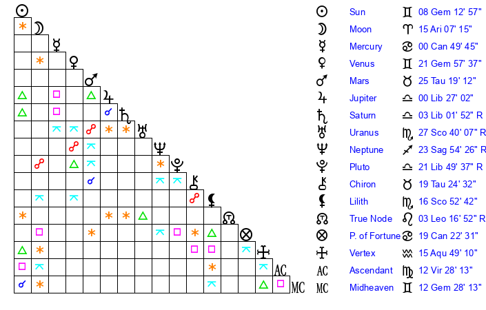 | Mercury | 0 Cancer 50 | 8 Gemini 0 | 29 Gemini 52 |