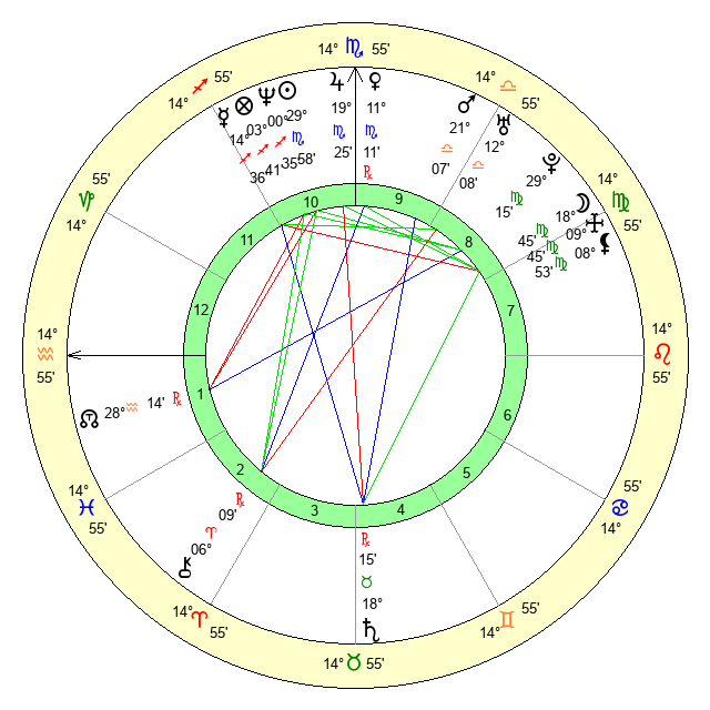 | Pluto | 29 Virgo 15 | 0 Aquarius 2 | 29 Virgo 38 |