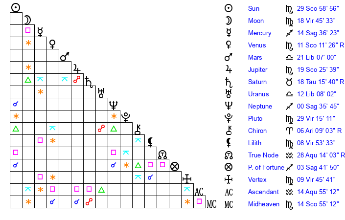 | Pluto | 29 Virgo 15 | 0 Aquarius 2 | 29 Virgo 38 |
