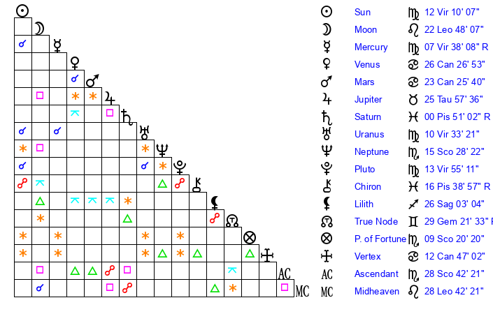 | Sun | 12 Virgo 10 | 12 Virgo 25 | 12 Scorpio 19 |