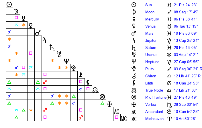 | Sun | 21 Pisces 24 | 21 Pisces 22 | 20 Aries 7 |