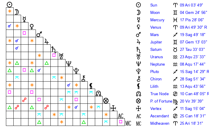 Sun | 9 Aries 4 | 9 Aries 15 | 2 Taurus 38 |