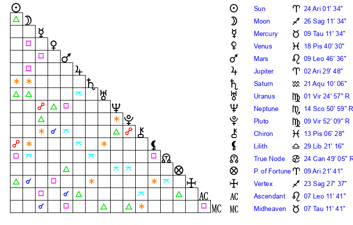 | Sun | 24 Aries 2 | 25 Aries 0 | 23 Gemini 52 |