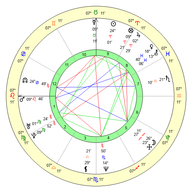 | Mars | 9 Leo 46 | 28 Cancer 36 | 6 Virgo 24 |