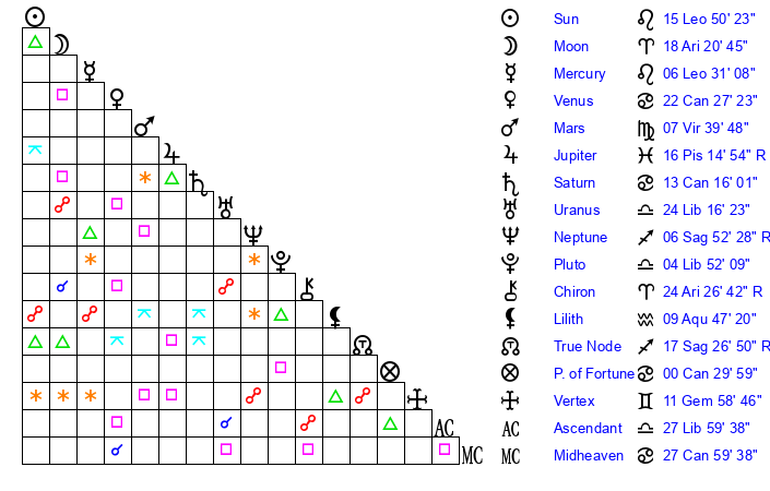Sun | 15 Leo 50 | 16 Leo 29 | 5 Libra 15 |