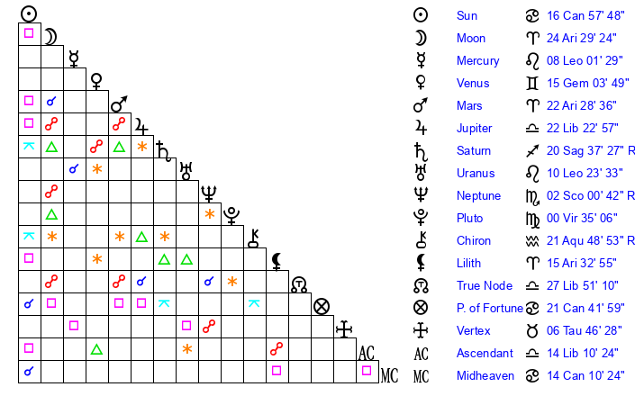 | Sun | 16 Cancer 58 | 17 Cancer 44 | 21 Virgo 22 |