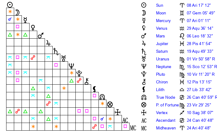 | Sun | 8 Aries 17 | 9 Aries 15 | 8 Gemini 34 |