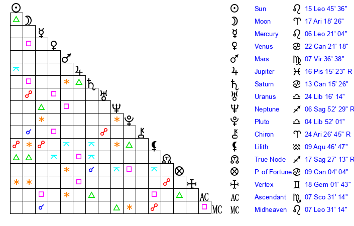 | Moon | 17 Aries 14 | 8 Aquarius 41 | 4 Pisces 25 |