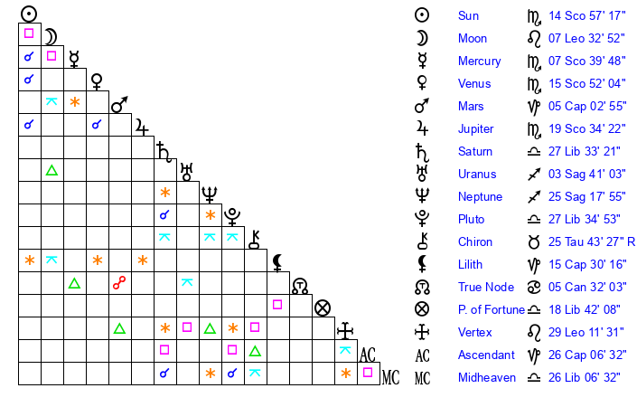 | Sun | 14 Scorpio 58 | 15 Scorpio 32 | 28 Sagittarius 29 |