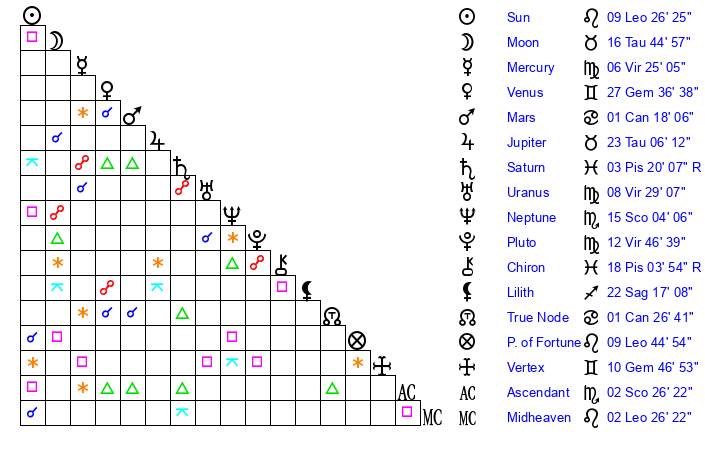 | Moon | 16 Taurus 38 | 11 Scorpio 41 | 18 Leo 33 |