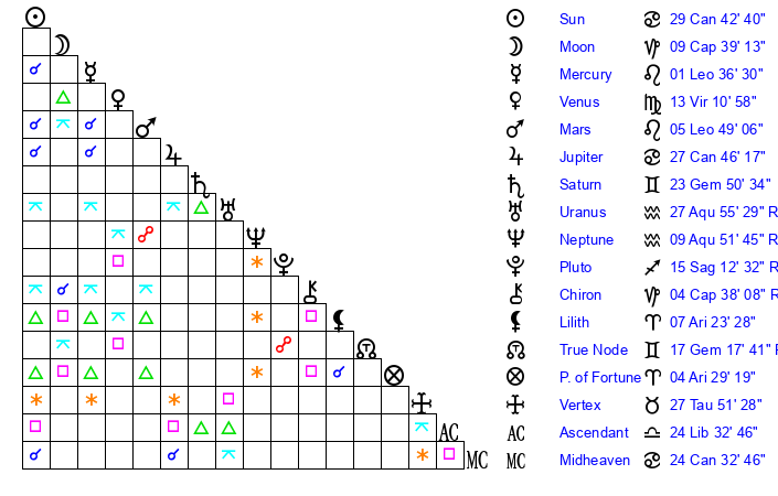 Moon | 9 Capricorn 31 | 2 Cancer 37 | 12 Scorpio 24 |