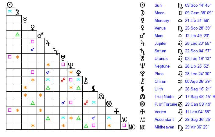 Moon | 9 Gemini 21 | 20 Scorpio 49 | 20 Sagittarius 21 |