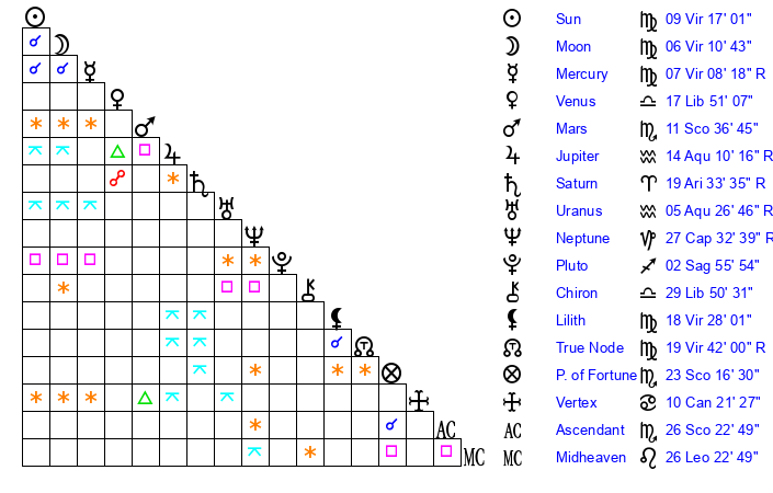 | Moon | 6 Virgo 9 | 25 Sagittarius 29 | 15 Virgo 1 |