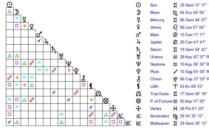 Sun | 29 Gemini 12 | 29 Gemini 37 | 21 Cancer 8 |
