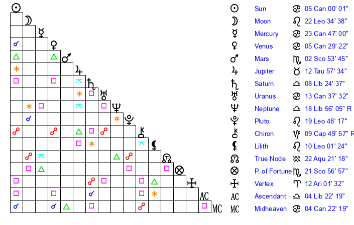 | Moon | 22 Leo 33 | 22 Cancer 20 | 3 Taurus 38 |