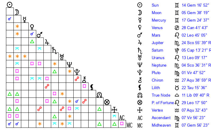 | Mercury | 17 Gemini 25 | 23 Gemini 15 | 9 Leo 9 |