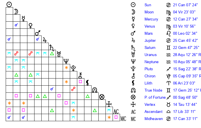 Moon | 4 Virgo 24 | 26 Aquarius 16 | 2 Cancer 42 |