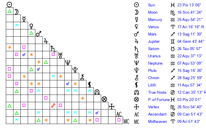 Sun | 23 Pisces 14 | 23 Pisces 24 | 17 Aries 0 |
