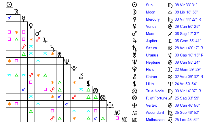 | Moon | 8 Libra 14 | 25 Sagittarius 29 | 5 Pisces 36 |