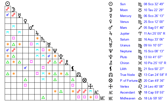 | Venus | 25 Scorpio 13 | 23 Libra 27 | 12 Aquarius 17 |