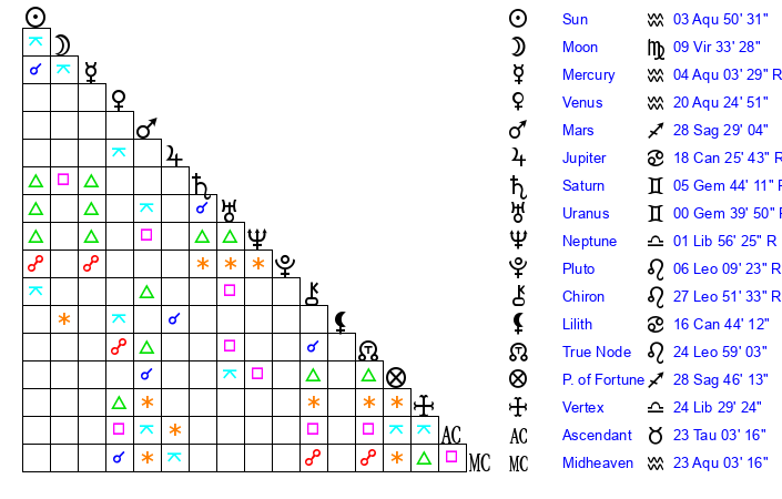 | Moon | 9 Virgo 35 | 6 Sagittarius 16 | 10 Virgo 40 |