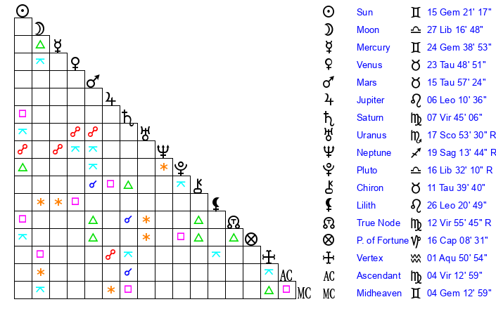 | Sun | 15 Gemini 21 | 16 Gemini 12 | 29 Cancer 15 |