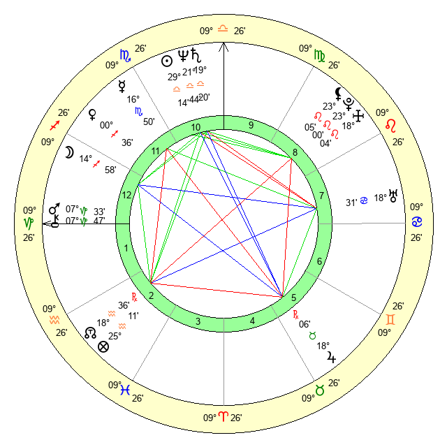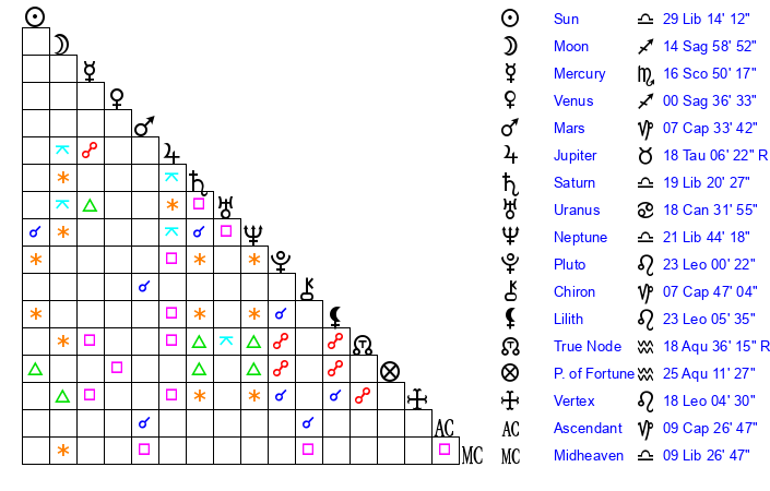 | Saturn | 19 Libra 49 | 26 Pisces 10 | 26 Libra 53 |