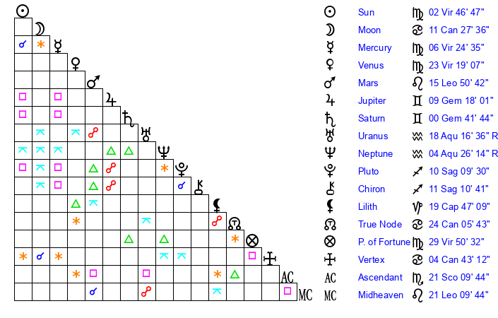 Mercury | 6 Virgo 25 | 16 Leo 6 | 18 Libra 8 |