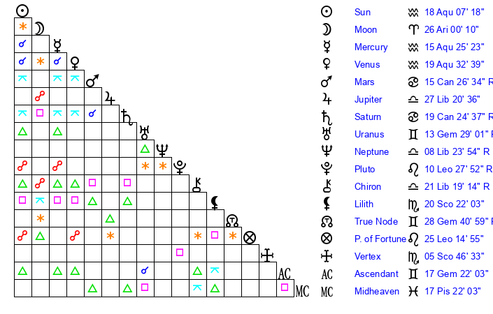 Mercury | 15 Aquarius 26 | 17 Aquarius 28 | 9 Aries 51 |