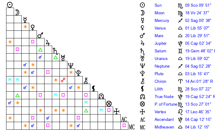 Sun | 9 Scorpio 10 | 9 Scorpio 33 | 1 Capricorn 46 |