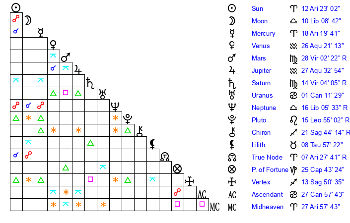 | Moon | 10 Libra 10 | 12 Gemini 27 | 6 Cancer 53 |