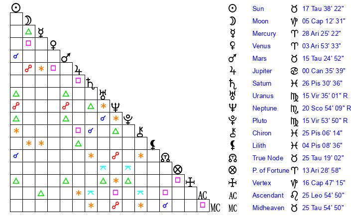| Neptune | 20 Scorpio 54 | 1 Aries 19 | 19 Scorpio 34 |