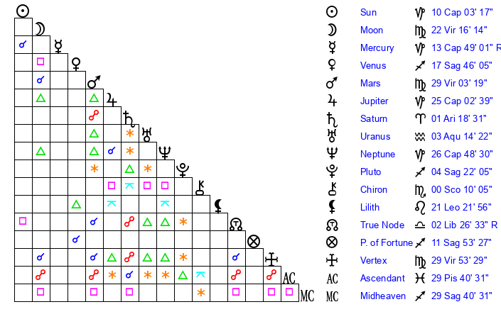 Moon | 22 Virgo 13 | 16 Capricorn 38 | 0 Libra 45 |