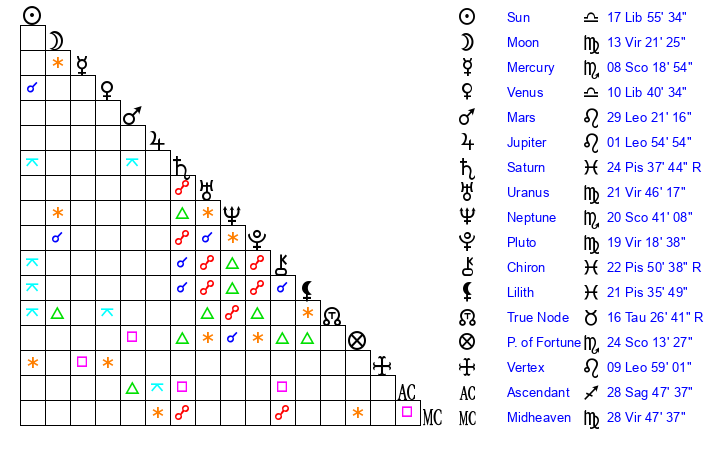 | Moon | 13 Virgo 21 | 21 Gemini 40 | 15 Scorpio 49 |
