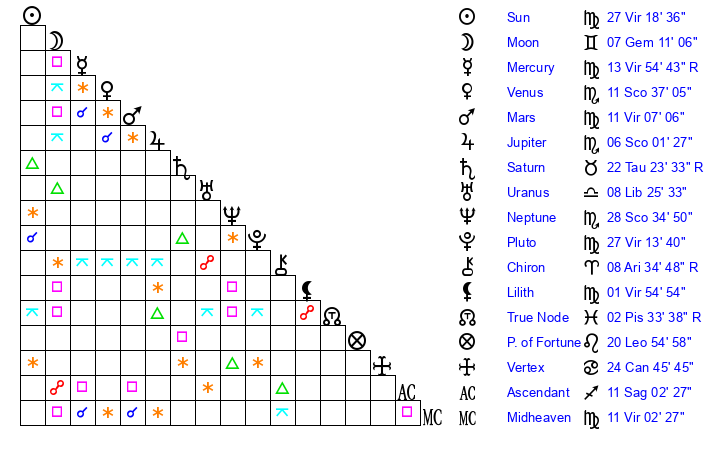 | Pluto | 27 Virgo 13 | 1 Aquarius 29 | 29 Virgo 3 |
