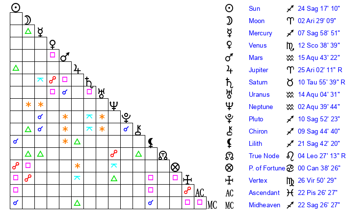 | Sun | 24 Sagittarius 17 | 25 Sagittarius 14 | 19 Capricorn 45 |