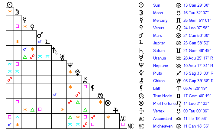 Moon | 16 Taurus 27 | 15 Scorpio 30 | 24 Pisces 43 |