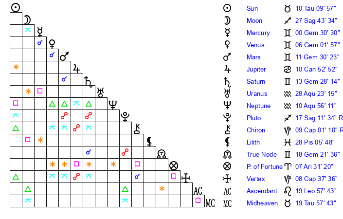 Sun | 10 Taurus 11 | 10 Taurus 36 | 2 Gemini 23 |