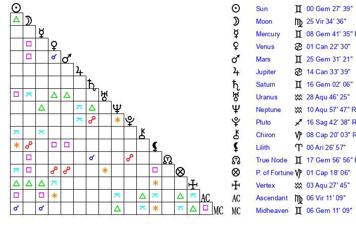 Moon | 25 Virgo 40 | 16 Pisces 12 | 26 Cancer 18 |