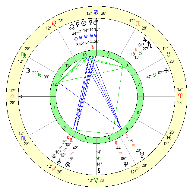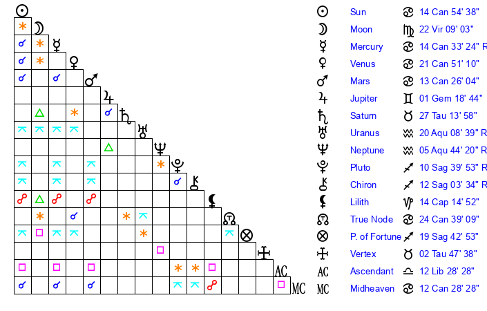 Moon | 22 Virgo 16 | 27 Scorpio 25 | 17 Leo 18 |